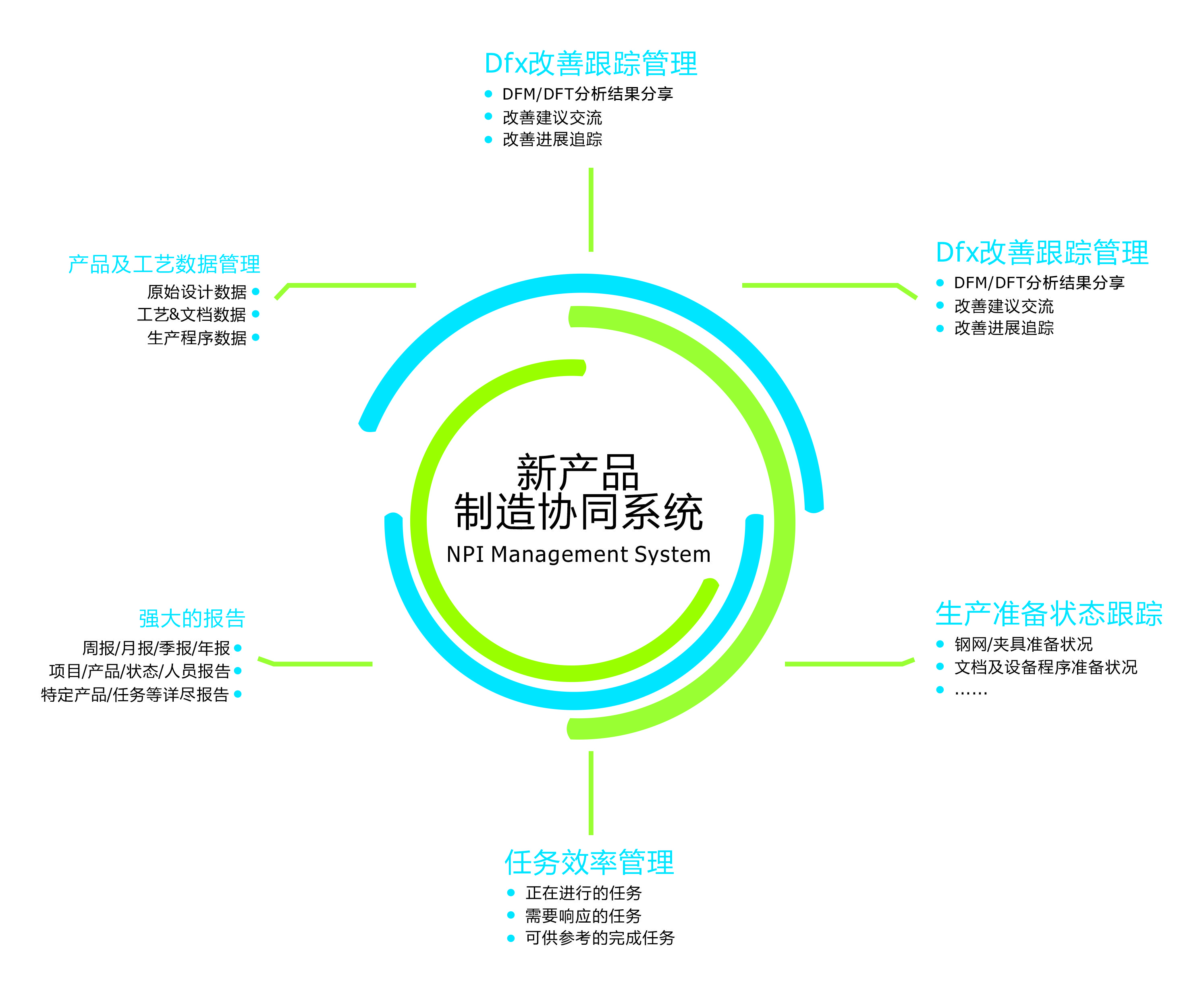新产品制造协同体系,帮助梳理各项相关流程事物,汇总和跟踪新产品导入过程中的问题,管理和记录这些问题的处理过程,并提供及时的信息给项目组成员,使其可以对项目进行及时的调整或安排,提高项目团队工作效率,减少新品导入过程中因沟通交流而花费的高额费用。
